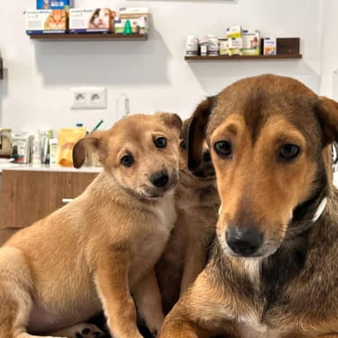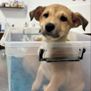 Le 24 novembre, il ne restait que 2 chiots et la maman, ils étaient, enfin, en état d'être transférés dans notre clinique vétérinaire habituelle. Nous avons fait faire un bilan complet à tous les trois et, ensuite, ils ont rejoint la pension familiale avec des grands sacs de croquettes Virbac chiots et du Nutrigel pour reprendre des forces et du poids.