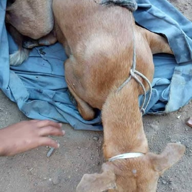 Elle a tellement souffert !!! Une photo montre dans quelles conditions elle a été récupérée dans un canal qui allait se remplir d'eau... Elle était ligotée de la sorte et abandonnée à son triste sort... Après toutes ces souffrances, elle a une patte arrière partiellement amputée, elle mérite le meilleur.